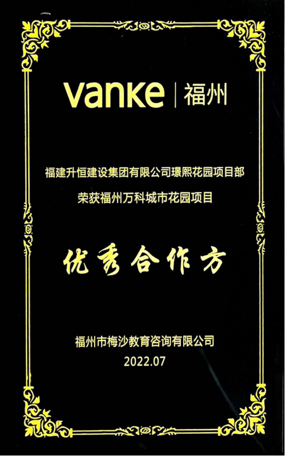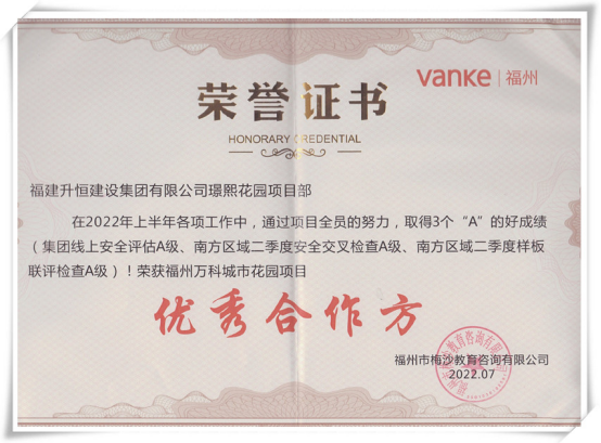 2022年上半年,我司万科璟熙花园项目部通过项目全员的努力,在本项目建设工作中表现突出,取得了三“A”的优异成绩(集团线上安全评估A级、南方区域二季度安全交叉检查A级、南方区域二季度祥板联评检查A级)!同时,被授予“优秀合作方”的称号。