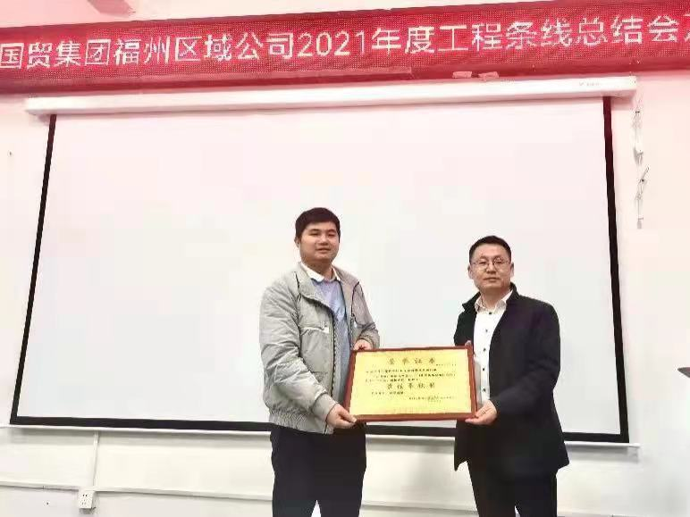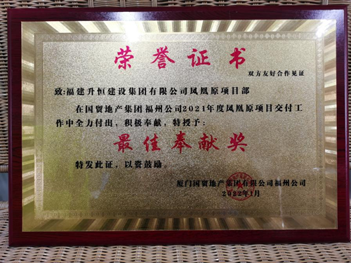2022年1月19日,国贸集团福州区域公司召开2021年度工程条线总结会及颁奖仪式,对作出突出贡献的合作单位进行表扬并授予证书。我司总监施巧辉带领的团队凤凰原项目部在本项目建设工作中表现突出,被授予“最佳奉献奖”称号。