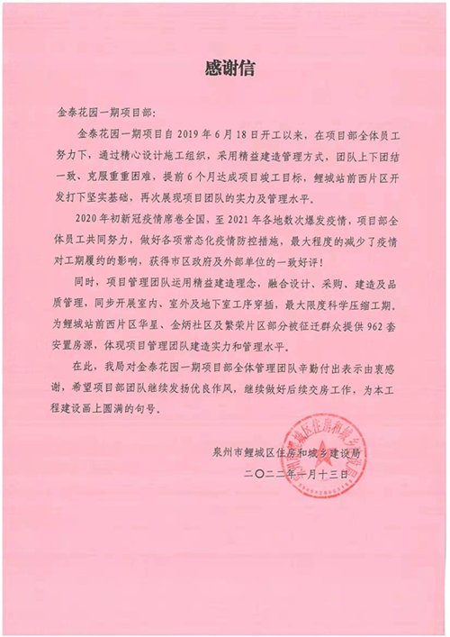 感谢泉州市鲤城区住房和城乡建设局对我们的肯定,我们将继续做好后续交房工作,为本工程建设画上圆满的句号。